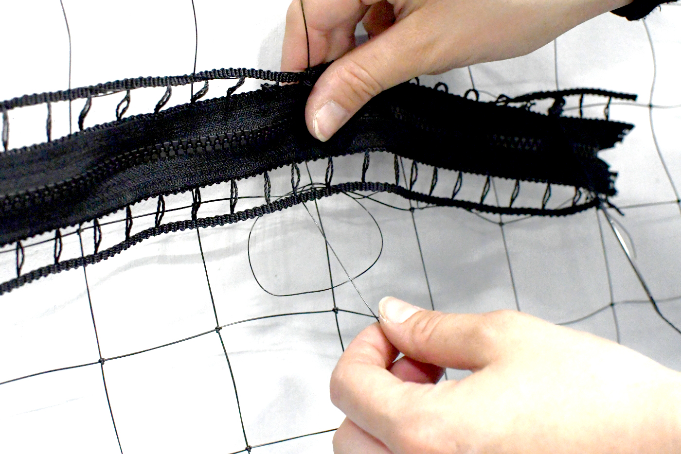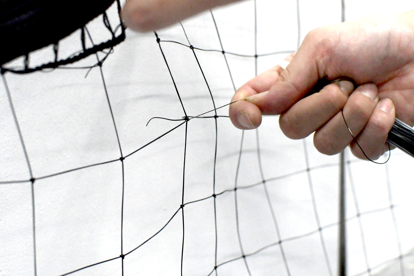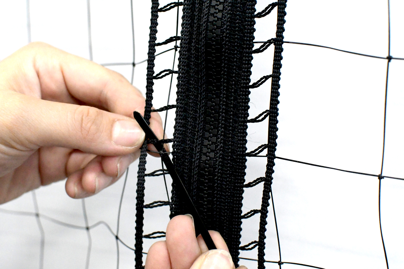 約15㎝間隔で結束バンドをつけていきます。結束バンドは、ネットとネット取付け耳ロープの部分を固定します。結束バンドの通し方はネットの結び目に対して斜めに通してください。